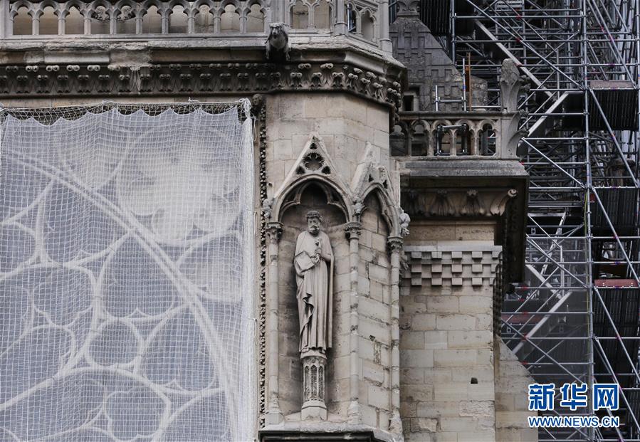 4月24日,在法国巴黎,巴黎圣母院主体建筑被防雨材料保护起来。新华社记者高静摄