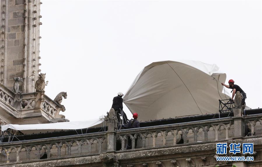 4月24日,在法国巴黎,工作人员为巴黎圣母院搭建防雨篷布。 新华社记者高静摄
