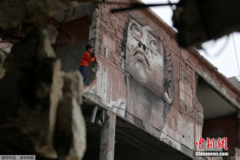 当地时间4月25日,巴勒斯坦艺术家Ali Al-Jabali在加沙地带一破损建筑的墙面上创作多幅壁画。据悉,该建筑内部将举行一场别样的艺术展览。