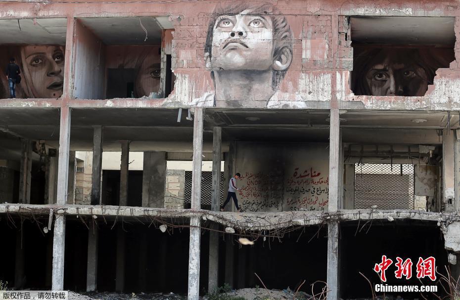 当地时间4月25日,巴勒斯坦艺术家Ali Al-Jabali在加沙地带一破损建筑的墙面上创作多幅壁画。据悉,该建筑内部将举行一场别样的艺术展览。