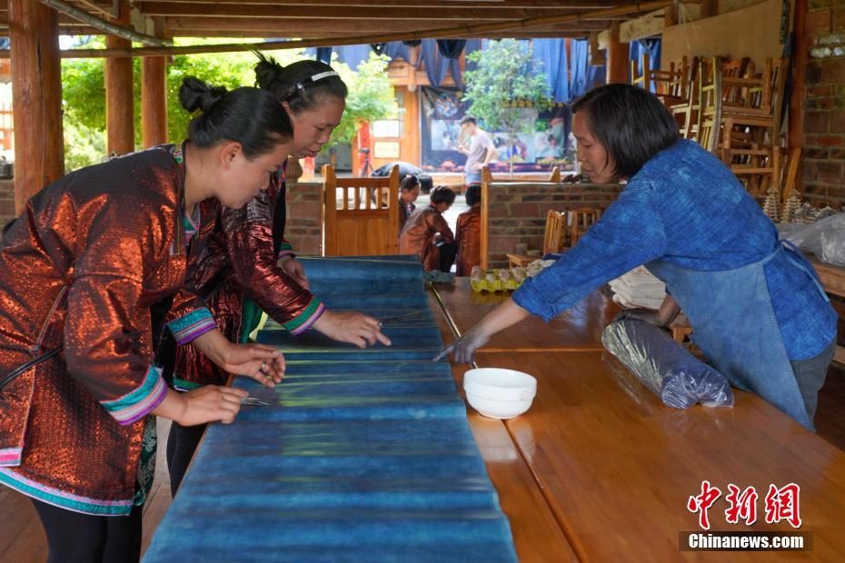 图为赖蕾在指导两位织娘对染蓝的侗布“上鸡蛋清”。中新社记者  贺俊怡 摄