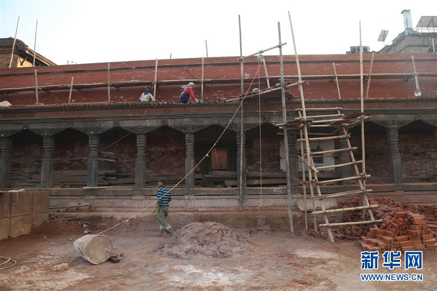 这是4月25日在尼泊尔加德满都拍摄的一处重建中的建筑。 当日是尼泊尔“4·25”地震四周年。2015年4月25日,尼泊尔中部地区发生强烈地震,造成超过9000人遇难、逾2.3万人受伤。 新华社发(苏尼尔·夏尔马摄)