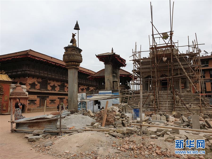 这是4月25日在尼泊尔加德满都拍摄的一处重建中的建筑。 当日是尼泊尔“4·25”地震四周年。2015年4月25日,尼泊尔中部地区发生强烈地震,造成超过9000人遇难、逾2.3万人受伤。 新华社发(苏尼尔·夏尔马摄)