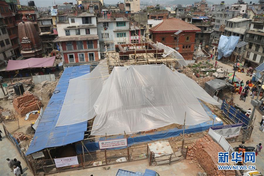 这是4月25日在尼泊尔加德满都拍摄的一处重建中的建筑。 当日是尼泊尔“4·25”地震四周年。2015年4月25日,尼泊尔中部地区发生强烈地震,造成超过9000人遇难、逾2.3万人受伤。 新华社发(苏尼尔·夏尔马摄)