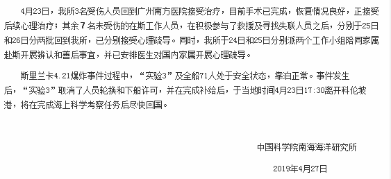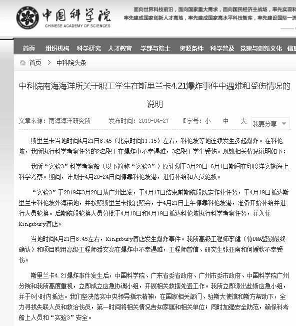中科院南海海洋所关于职工学生在斯里兰卡4.21爆炸事件中遇难和受伤情况的说明