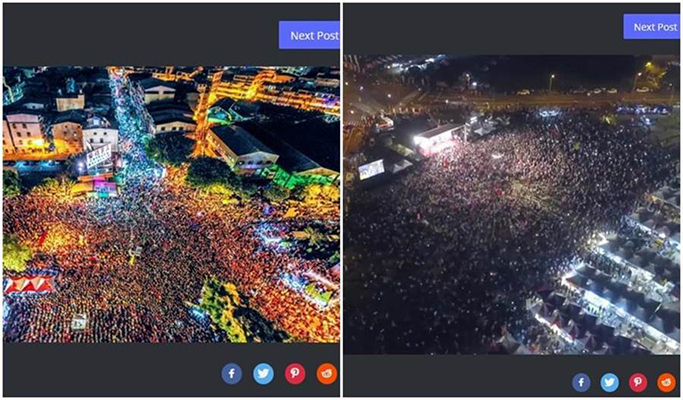 PTT网友贴文图指出,去年高雄市长选举,前“立法院长”王金平帮韩国瑜动员,大家都坐椅子,一格一格的,很整齐,密度也比较高;而27日挺韩大会凤山场的空拍图,大家用站的,看上去比较稀疏,但不可否认,非选举期间有这人数,真的很惊人。网友接着说,更何况韩国瑜先前说不来,有这种人数真的蛮夸张!