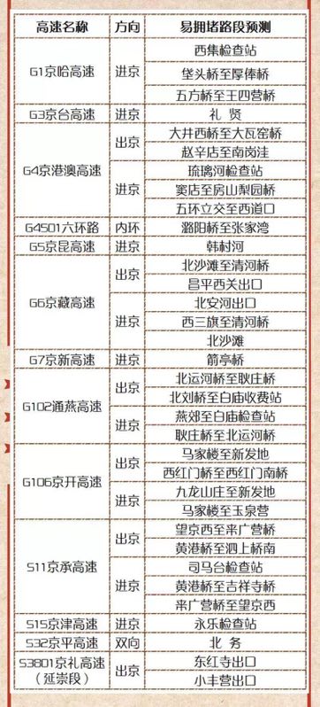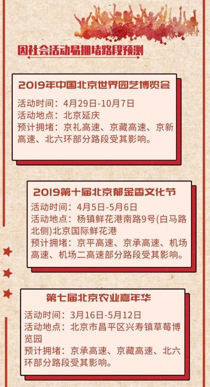 具体为13条高速的部分路段容易拥堵。此外,因世园会、农业嘉年华等活动召开,京礼、京藏等高速路易堵。