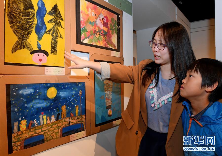 4月27日,小朋友在第十届海峡两岸少儿美术大展上参观。 当日,第十届海峡两岸少儿美术大展在台北开幕。本次展览以“理想世界”为主题,共展出少儿作品近300幅。 新华社记者 张国俊 摄