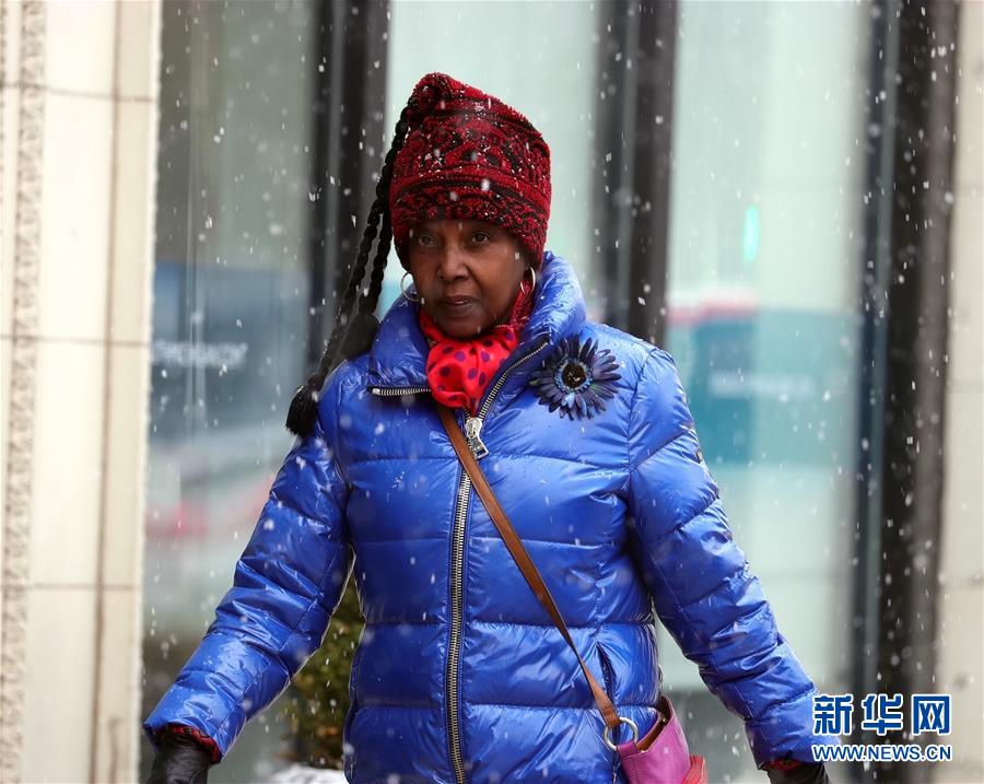 4月27日,在美国芝加哥,一名女士冒雪出行。 美国第三大城市芝加哥27日罕见降雪,气温骤降。 新华社记者 汪平 摄