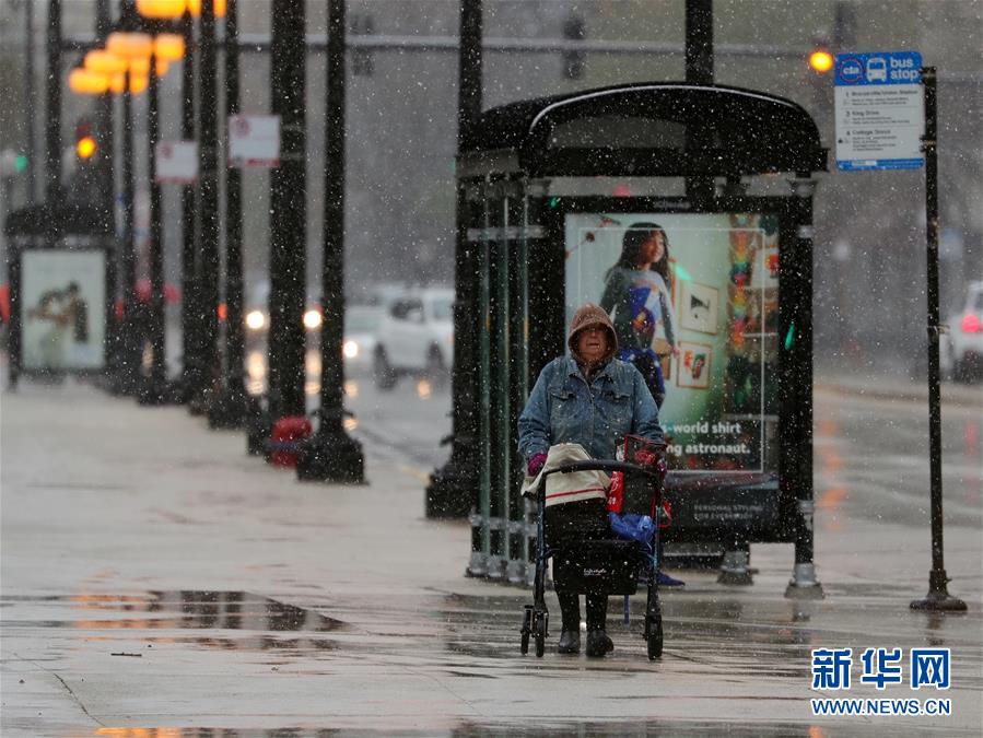 4月27日,在美国芝加哥,一名女士冒雪出行。 美国第三大城市芝加哥27日罕见降雪,气温骤降。 新华社记者 汪平 摄