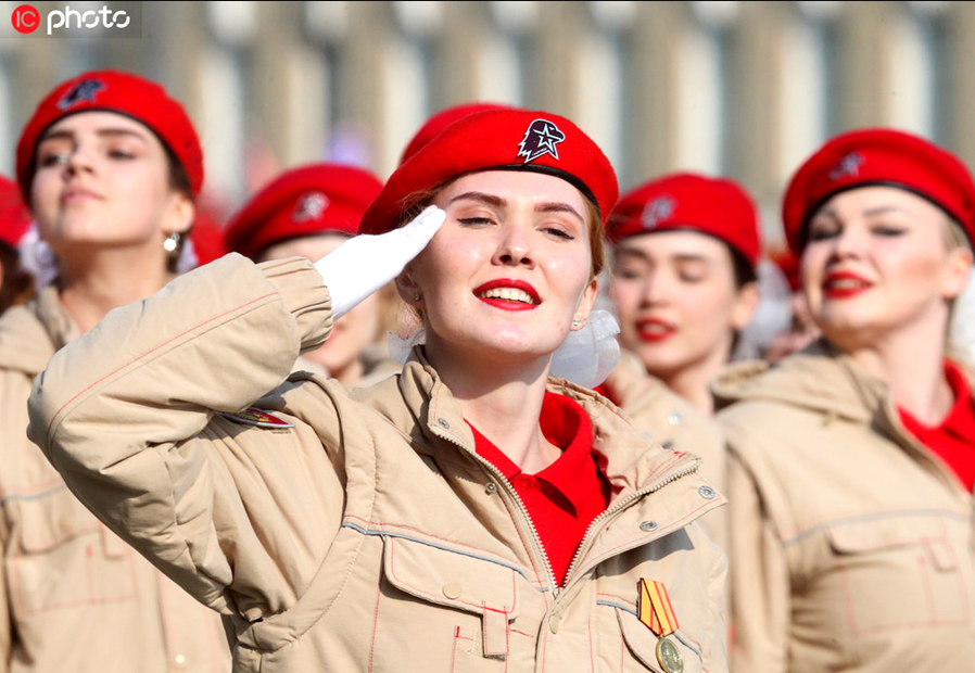 俄圣彼得堡举行胜利节阅兵彩排 飒爽女兵方队抢镜