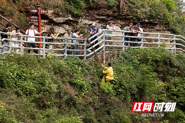 粟松云总会小心翼翼地下到悬崖深处,将捡到的垃圾放进随身携带的垃圾袋内,然后开始往上攀登。 “这么高,万一掉下去怎么办?”不时会有游客惊呼这项工作的危险性。悬崖上拾垃圾惊险,看上去很刺激,粟松云在放绳下降的过程中,总是会吸引不少好奇的游客驻足观看,有的甚至拿起相机拍下了他们放绳作业的过程。