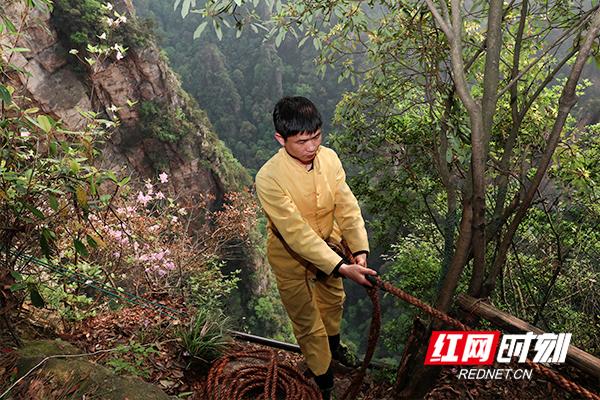 一根绳子系在腰间,在悬崖峭壁陡坡上忙上忙下。他的身后,就是万丈深渊。今年35岁的粟松云,有着双重的身份,白天,他是张家界武陵源景区的一名特技表演者,黄昏时,他又变身为悬崖上的“清道夫”,负责清理悬崖上游客乱扔的“烂摊子”。不管哪种身份,他的搭档都是一根棕绳。