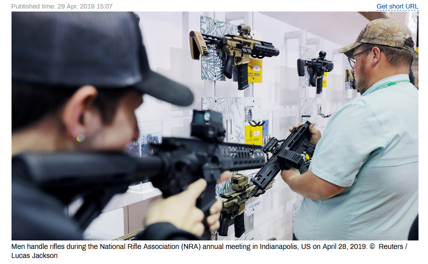 (4月28日,美国印第安纳波利斯举行的全国步枪协会年会上,一名男子手持步枪 图片来源:RT报道截图)
