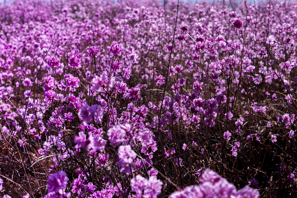 2019年4月21日,辽宁鞍山,岫岩满族自治县的黄岭村野生映山红分布在紧挨着的三座大山的山坡,在4月中下旬的盛花期,山野将迎来省内外数以万计的游客前来赏花。