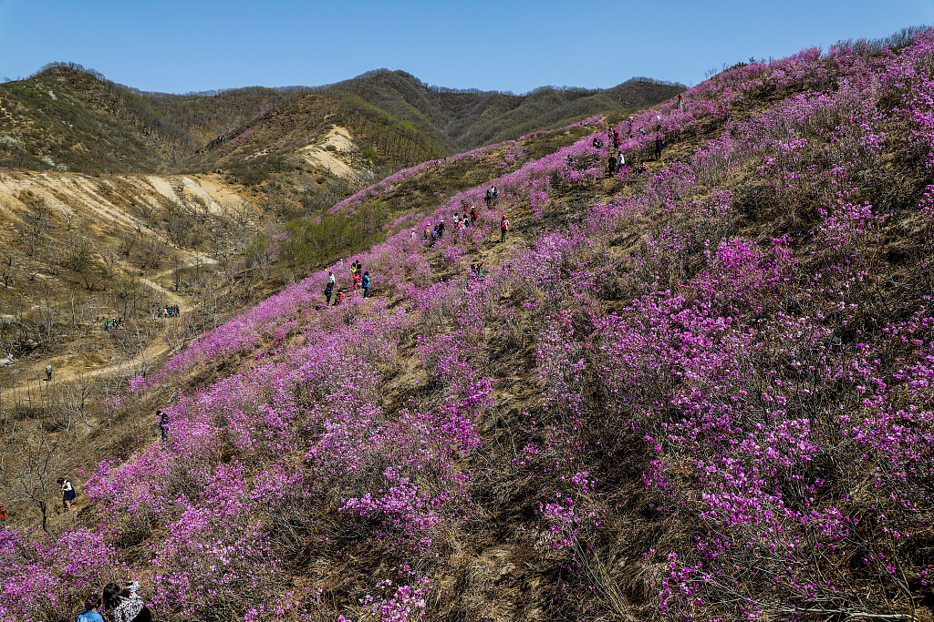 2019年4月21日,辽宁鞍山,岫岩满族自治县的黄岭村野生映山红分布在紧挨着的三座大山的山坡,在4月中下旬的盛花期,山野将迎来省内外数以万计的游客前来赏花。
