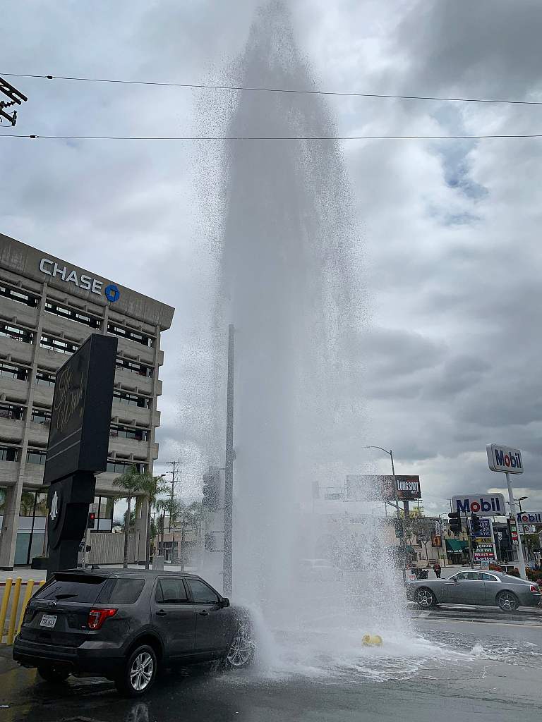 当地时间2019年4月29日,美国加州洛杉矶,在皮科大道,消防栓遭车撞断,水喷出如“瀑布”。