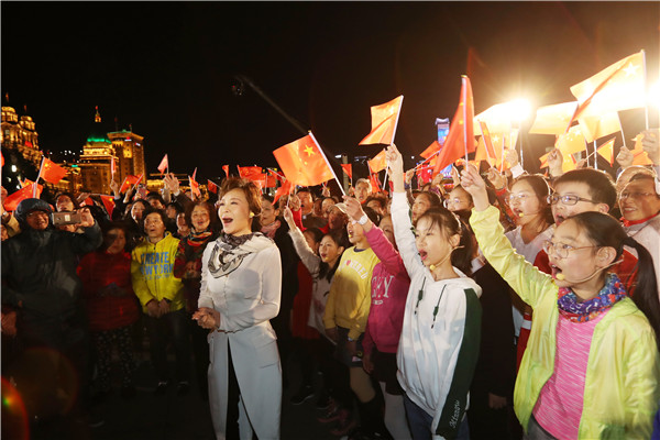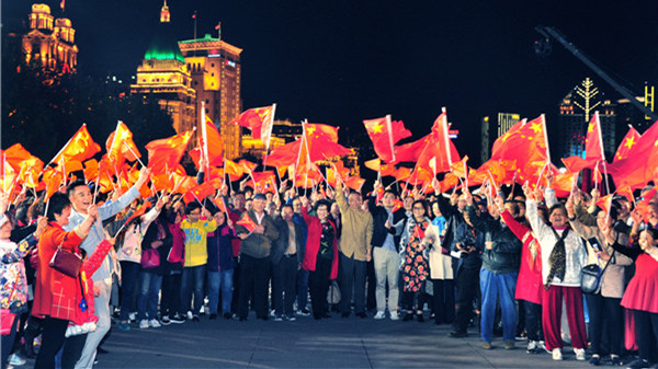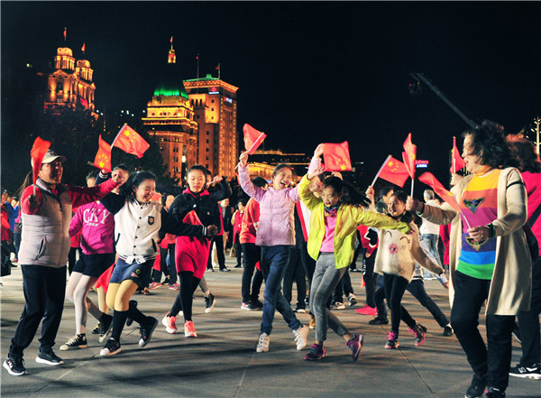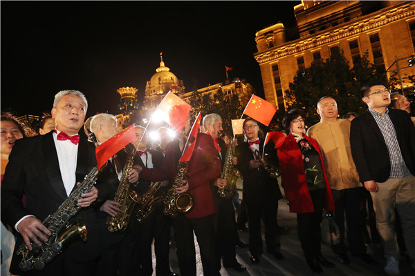 昆曲艺术家张军、新闻主播叶蓉、和平饭店爵士乐队、黄浦区劳模代表、春天少年合唱团的少年们……出人意料地闪现在人流如梭的外滩,用不同的方式唱响《我和我的祖国》。外滩成了一片红色的欢乐海洋:轮滑少年手执国旗在人群前滑过,江边和浦江游轮上的人们兴奋地互相舞动着国旗,钟楼在灯光投射下“身披”一面巨型国旗……越来越多的游人围聚过来跟着一起高歌,人们拿出手机记录下这一特别的时刻。歌曲结束时,欢呼声响彻外滩。“我爱中国,我爱上海”,孩子们雀跃高呼。