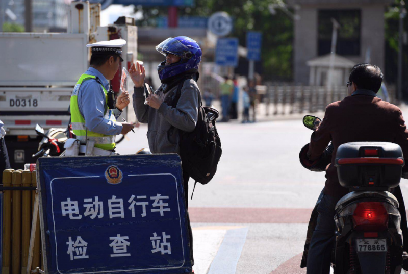 西城交通支队广安门大队副大队长李宁表示,自5月1日起,对未申领临时标识的超标电动车,交管部门将先予扣留电动自行车,对驾驶人处1000元罚款,驾驶人接受处理后,交管部门将依法及时将电动自行车予以发还。(文/北京青年报记者 赵加琪 摄影/北京青年报记者 杨益)