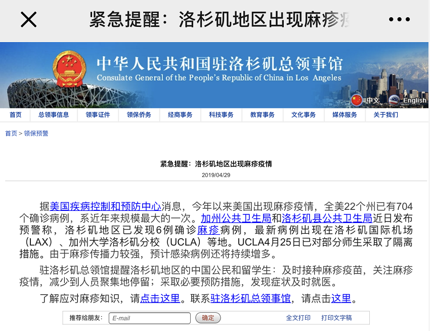由于麻疹传播力较强,预计感染病例还将持续增多。驻洛杉矶总领馆提醒洛杉矶地区的中国公民和留学生:及时接种麻疹疫苗,关注麻疹疫情,减少到人员聚集地停留;采取必要预防措施,发现症状及时就医。