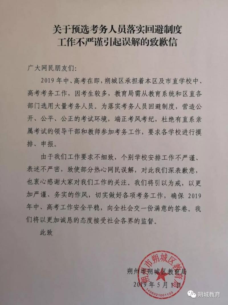 1日晚间,朔州市朔城区教育局在其官方微信发布“关于预选考务人员落实回避制度工作不严谨引起误解的致歉信”。