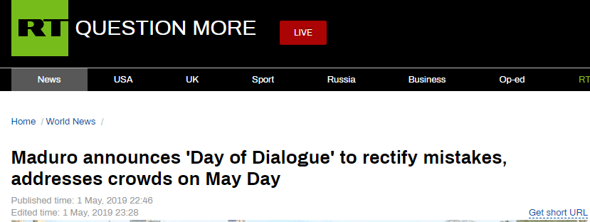 “今日俄罗斯”(RT)1日报道称,当天,在人们庆祝国际劳动节之时,马杜罗在委内瑞拉首都加拉加斯发表讲话,指责美国支持的委反对派领导人胡安•瓜伊多试图引发内战。