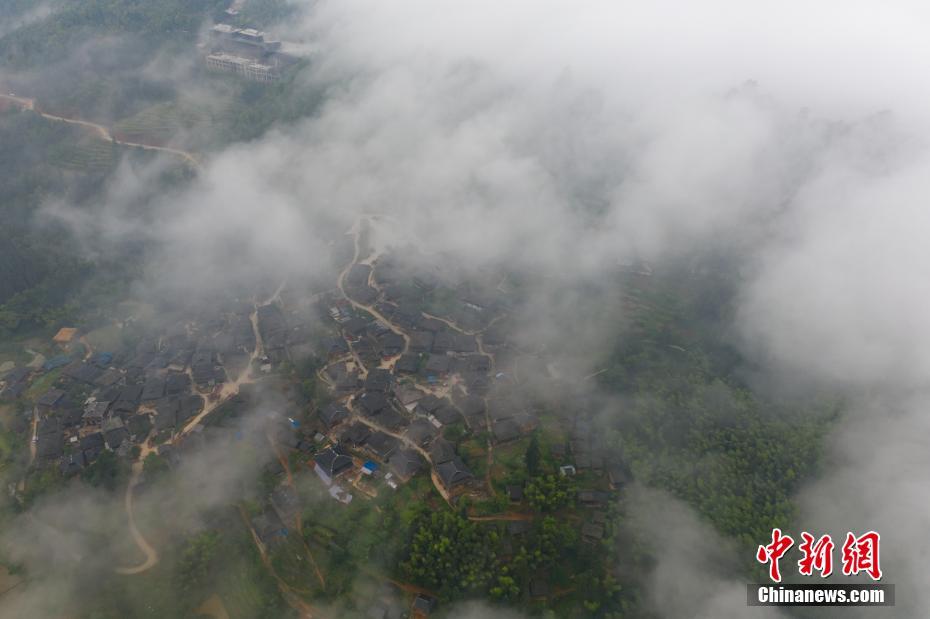 5月3日,航拍传统村落贵州岜沙苗寨,吊脚楼在云雾中若隐若现,宛若仙境。贵州省从江县岜沙村是一个崇尚自然、以树为神的苗家村寨,被誉为“世界最后一个枪手部落”。2012年,贵州岜沙被列入第一批中国传统村落名录。 中新社记者 贺俊怡 摄
