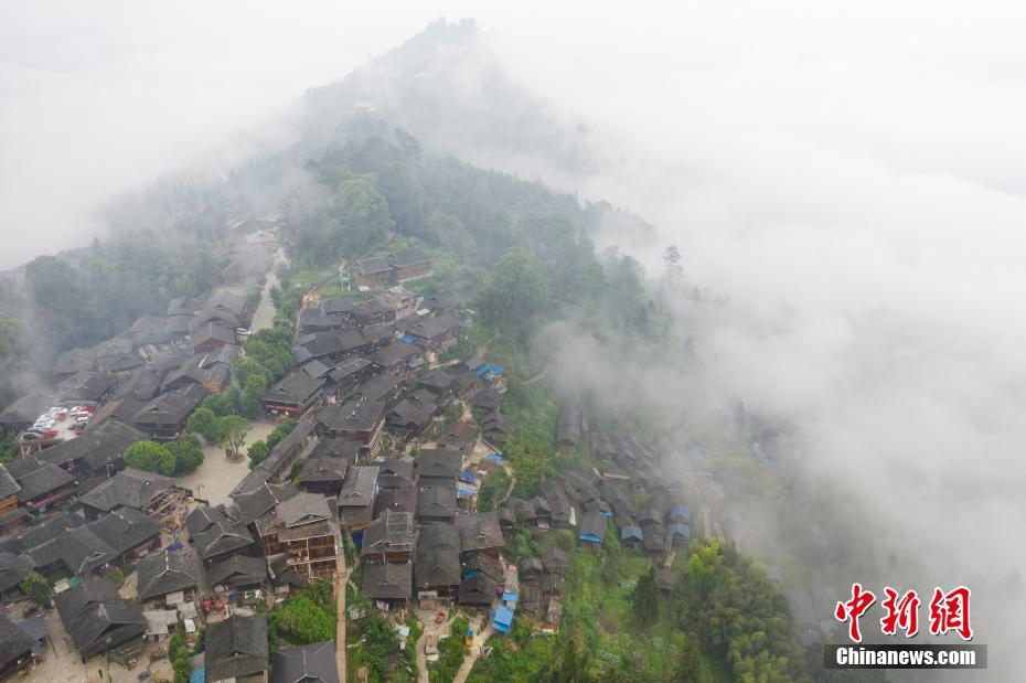 5月3日,航拍传统村落贵州岜沙苗寨,吊脚楼在云雾中若隐若现,宛若仙境。贵州省从江县岜沙村是一个崇尚自然、以树为神的苗家村寨,被誉为“世界最后一个枪手部落”。2012年,贵州岜沙被列入第一批中国传统村落名录。 中新社记者 贺俊怡 摄