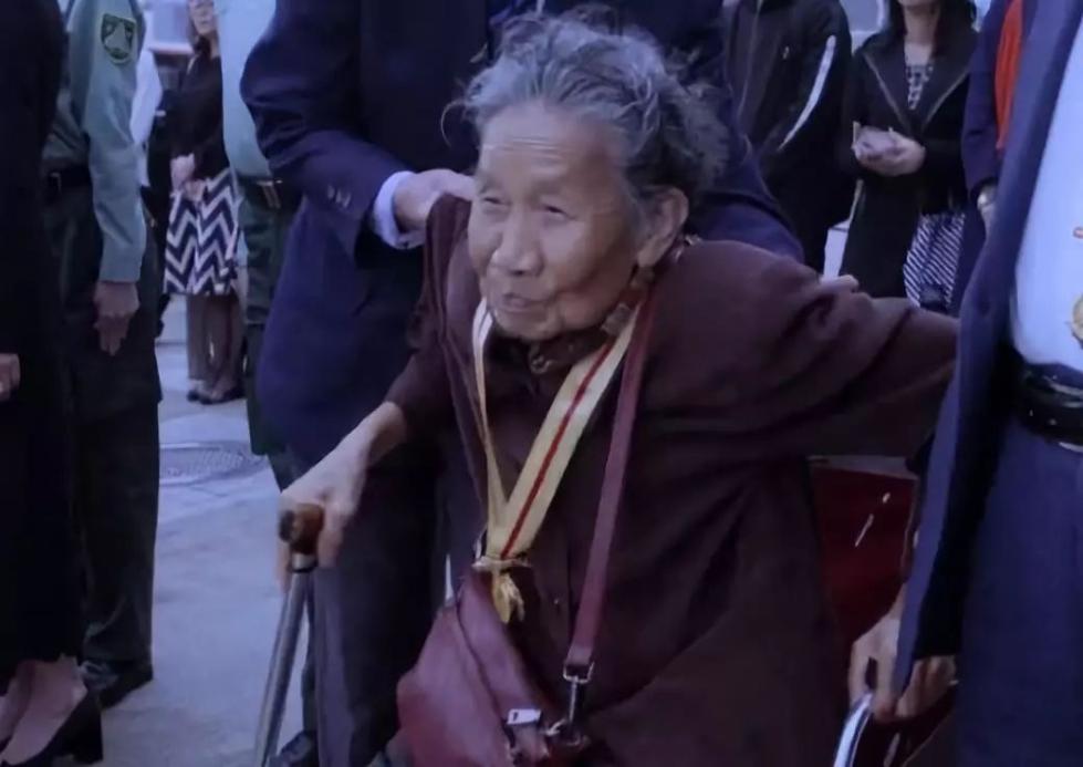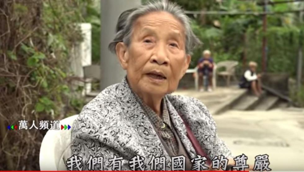 下图中这位名叫罗志萍的老婆婆,便是当天从轮椅上起身向国旗行礼、并深情唱响国歌的老人。