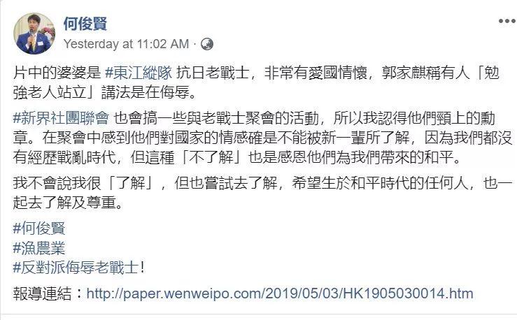 香港立法会委员何俊贤就在他的社交账号上确认了此事,并介绍说老人非常有爱国情怀,而郭家麒抛出的“老人是‘被逼起身’的言论”则是在侮辱她。