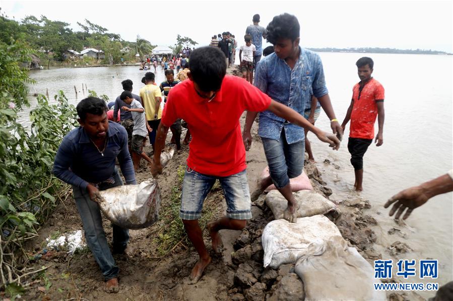 5月4日,在孟加拉国库尔纳,人们修补沙袋路堤。 热带气旋“法尼”4日从孟加拉国西南部登陆,带来大风、暴雨、闪电等恶劣天气。政府官员说,恶劣天气已造成大约6人死亡,另有60余人受伤。 新华社发