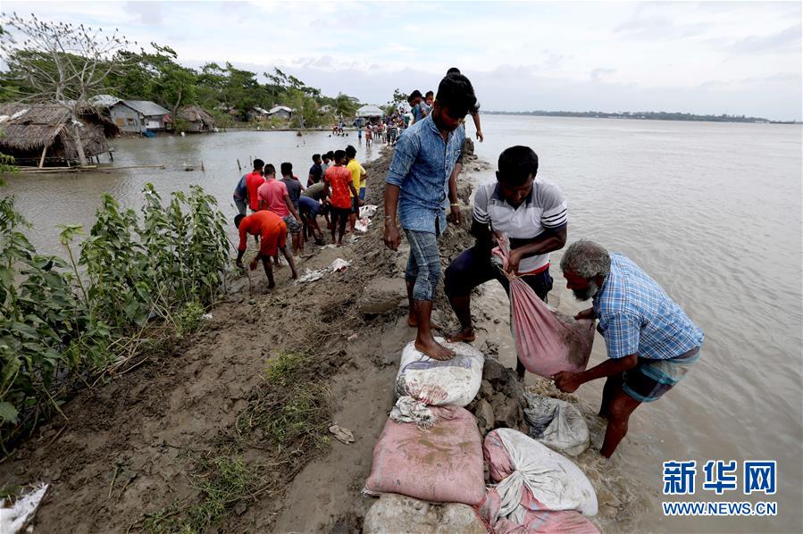 5月4日,在孟加拉国库尔纳,人们修补沙袋路堤。 热带气旋“法尼”4日从孟加拉国西南部登陆,带来大风、暴雨、闪电等恶劣天气。政府官员说,恶劣天气已造成大约6人死亡,另有60余人受伤。 新华社发