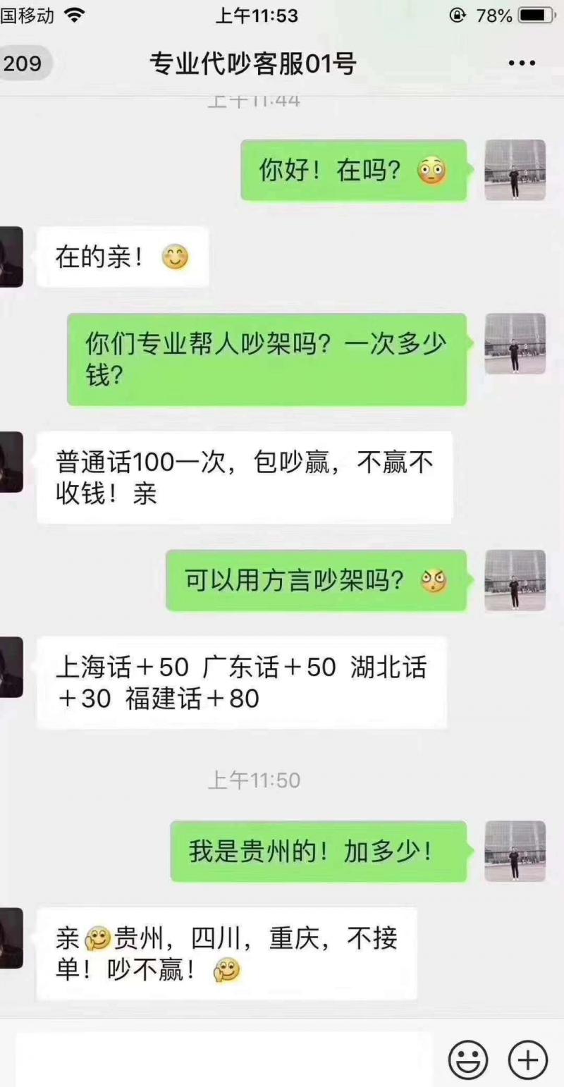 近日,一张“专业代吵服务”的聊天截图在微信群流传。其中对话显示,“专业代吵服务”明码标价:普通话100元/次,包吵赢;方言代吵的分地域单加钱,而需要代吵贵州、四川、重庆方言的,对话中则明确表示不接单,因为“吵不赢”。