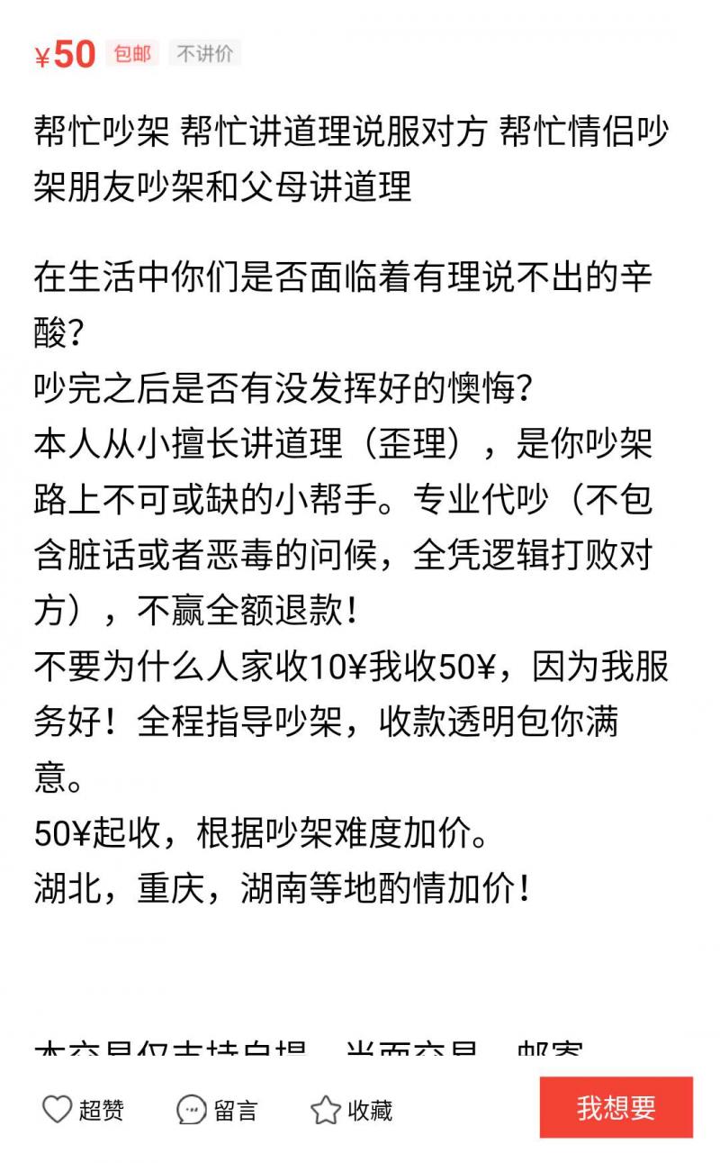 此外,记者还发现有50元起步的高端“代吵”服务,能帮忙吵架,也能代为讲道理。店家商品描述“从小擅长讲道理(歪理),是你吵架路上不可或缺的小帮手。专业代吵(不包含脏话或者恶毒的问候,全凭逻辑打败对方),不赢全额退款!”
