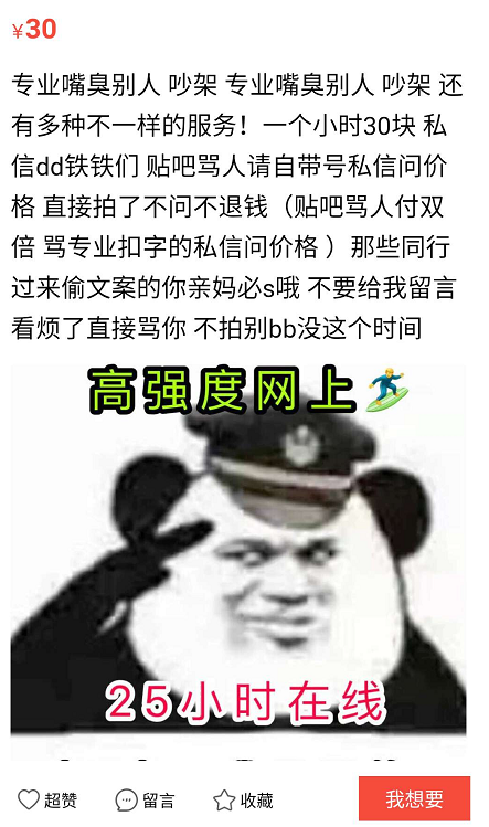 记者购买了一家号称“25小时在线”的专业代吵的商品,店家表示最近查得严,打电话太容易被人肉,而且需要加钱,需要100元。如果选微信骂,则仅需30元。记者选择微信代骂,对方表示目标对象将自己删除就算骂赢了。店主称曾经和一个目标对象吵了两三天。