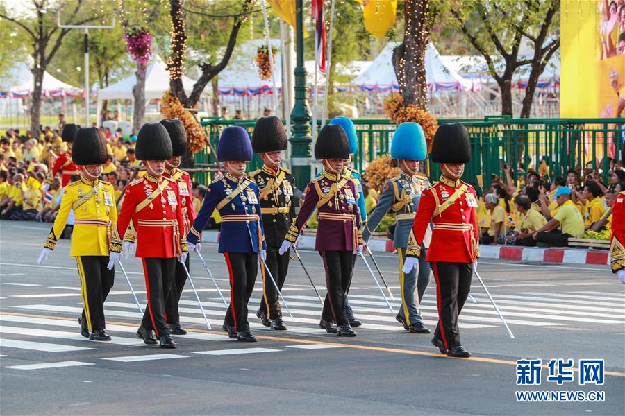 5月5日,仪仗队在曼谷大王宫附近举行的泰国国王加冕典礼巡游上列队前进。 新华社记者 张可任 摄