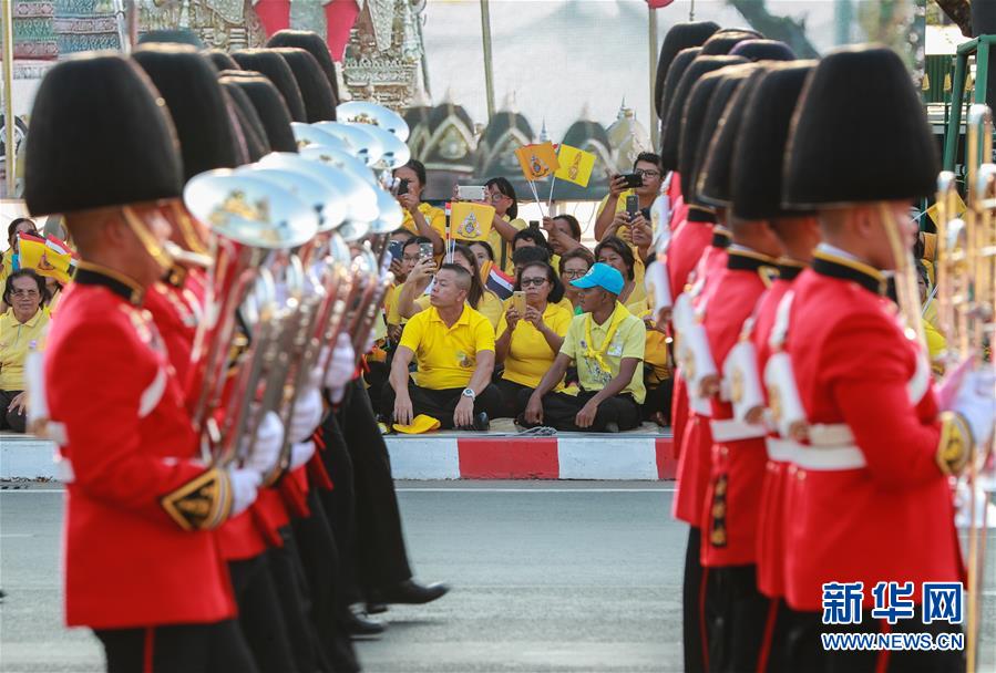 5月5日,仪仗队在曼谷大王宫附近举行的泰国国王加冕典礼巡游上列队前进。  新华社记者 张可任 摄