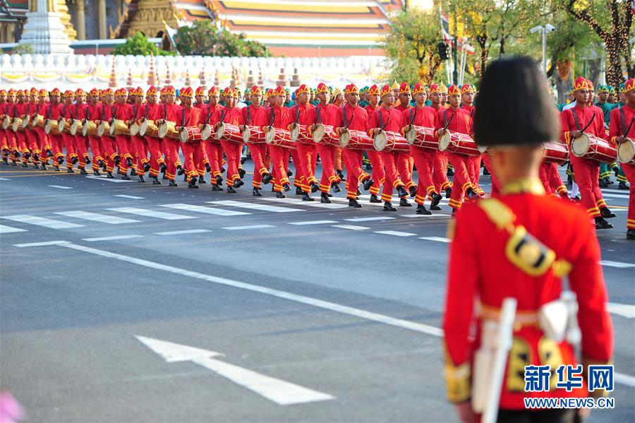 5月5日,仪仗队在曼谷大王宫附近举行的泰国国王加冕典礼巡游上列队前进。  新华社发(拉亨摄)