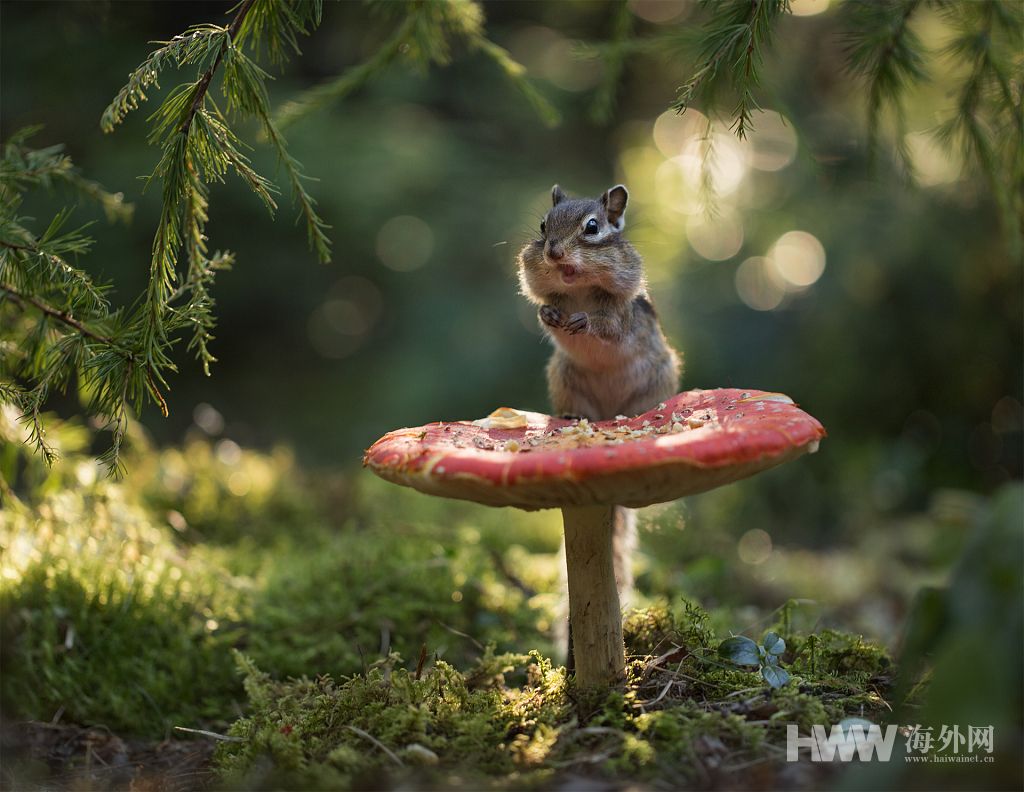 花栗鼠将蘑菇当“T台” 上蹿下跳展现优美身段