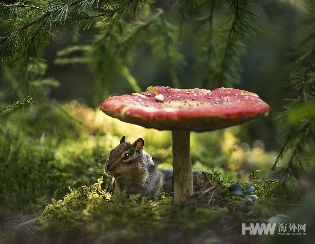 花栗鼠将蘑菇当“T台” 上蹿下跳展现优美身段
