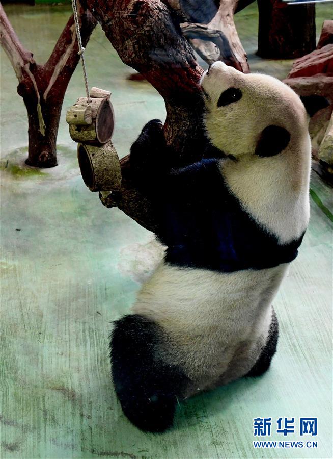 大熊猫“圆圆”在台北动物园熊猫馆玩耍(4月28日摄)。新华社记者 张国俊 摄