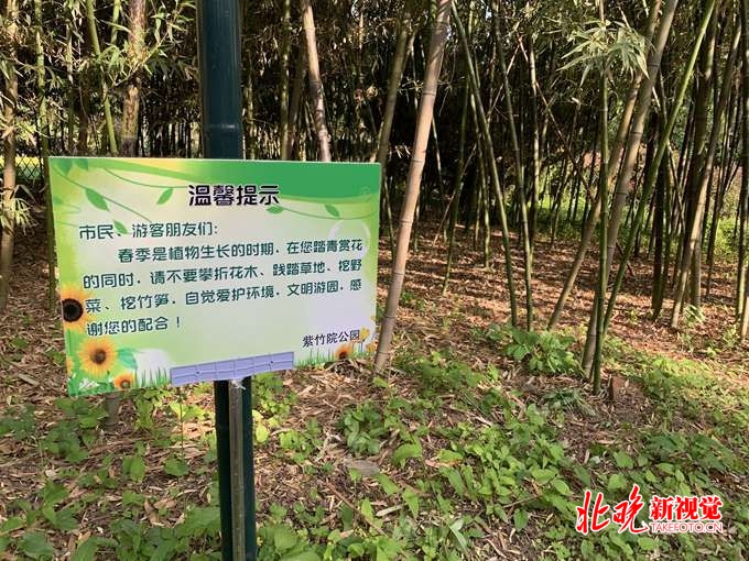 在紫竹院公园,小路边、竹林下随处可见“正值笋期,勿入竹林”“请不要挖竹笋”的警示牌和标语,可仍有一些人对此置若罔闻,挖笋、掰笋、踏入竹林踢断笋的现象时有发生。“竹笋就是幼竹,破坏一株刚长出二三十厘米的竹笋就等于毁了一株未来能长到十多米高的竹子。而且公园内很多观赏竹种稀少珍贵,竹笋被挖,就会影响以后的发芽和生长。”对于紫竹院公园这些负责养竹、护竹的工作人员来说,这样的不文明行为让他们倍感心疼。