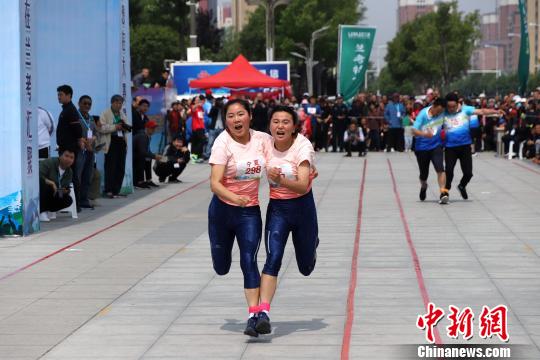 图为双人组两名女选手合力奔跑前行。 刘鹏 摄