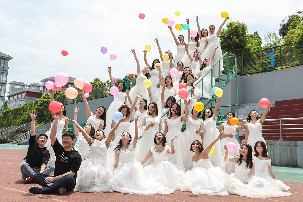2019年5月9日,湖北省襄阳市,湖北文理学院医学院护理系1512班的32名女生和2名男生在校园内拍摄创意毕业照。当天,32名女生身着婚纱和同班的两名男生在校园拍了一组创意毕业照,以留下校园岁月的美好回忆,告别学生时代。又到一年毕业季,学校的学生以多种方式拍摄展现个性与活力的毕业照,为校园生活留下美好回忆。