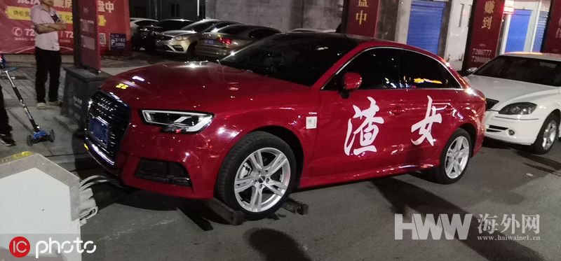 2019年5月17日,近日,四川渠县一辆大红色奥迪,车身贴着硕大“渣女”招摇过市,被到市民吐槽、举报。该车由于乱停乱放、车身与登记颜色不一致等违法行为遭到公安交警查处。(图:东方IC)