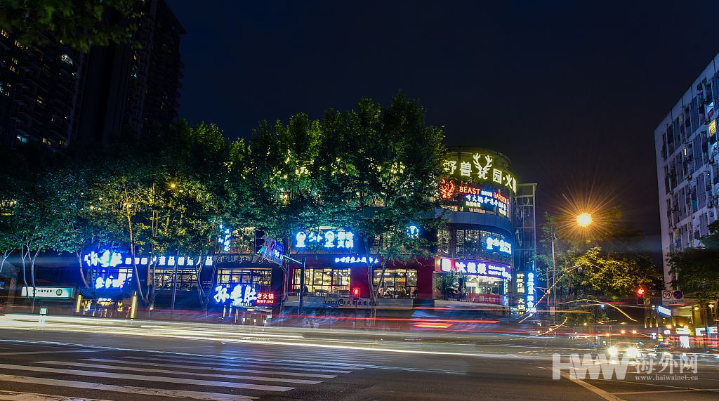 傍晚,成都东大街太古里旁的一栋4层大楼外,数十家火锅店的招牌闪闪发亮,人影穿梭,前来吃火锅的人排起了长龙。(图:视觉中国)