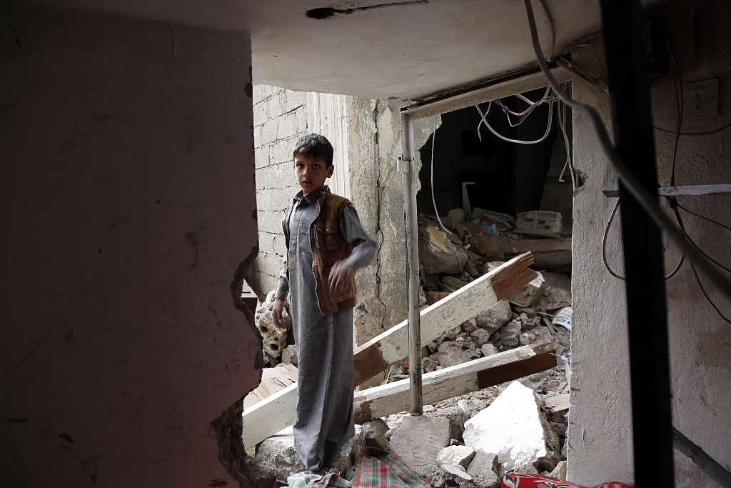 当地时间2019年5月17日,也门萨那,萨那遭空袭后受到严重破坏,幸存者在医院接受治疗。沙特领导的多国联军16日空袭了也门首都萨那,造成数十人伤亡。