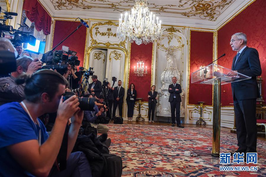 5月18日,在奥地利维也纳,奥地利总统范德贝伦(右一)在总统府举行的新闻发布会上讲话。 新华社记者 郭晨 摄