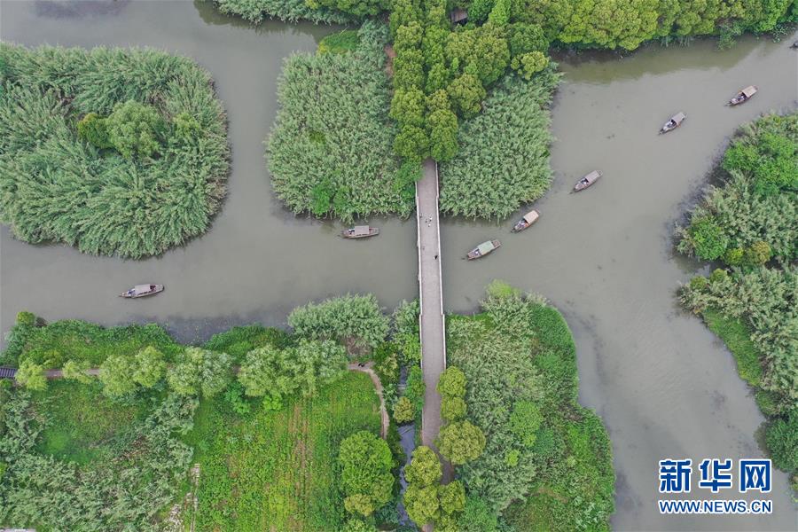 在沙家浜风景区,人们在革命教育区参观(5月18日无人机拍摄)。沙家浜风景区位于江苏省常熟市南隅,属于阳澄湖水系,周边水网密布。沙家浜风景区拥有独特的历史人文和自然生态资源,是国家5A级景区、国家湿地公园、全国百家红色旅游经典景区、全国爱国主义教育示范基地,每年吸引大量游客前来参观游览。新华社记者 季春鹏 摄