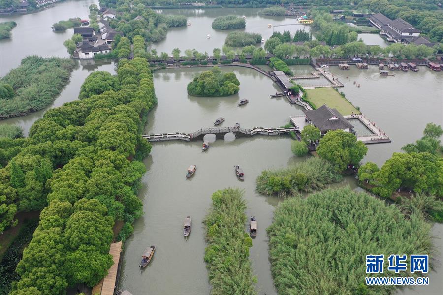 在沙家浜风景区,人们在革命教育区参观(5月18日无人机拍摄)。沙家浜风景区位于江苏省常熟市南隅,属于阳澄湖水系,周边水网密布。沙家浜风景区拥有独特的历史人文和自然生态资源,是国家5A级景区、国家湿地公园、全国百家红色旅游经典景区、全国爱国主义教育示范基地,每年吸引大量游客前来参观游览。新华社记者 季春鹏 摄